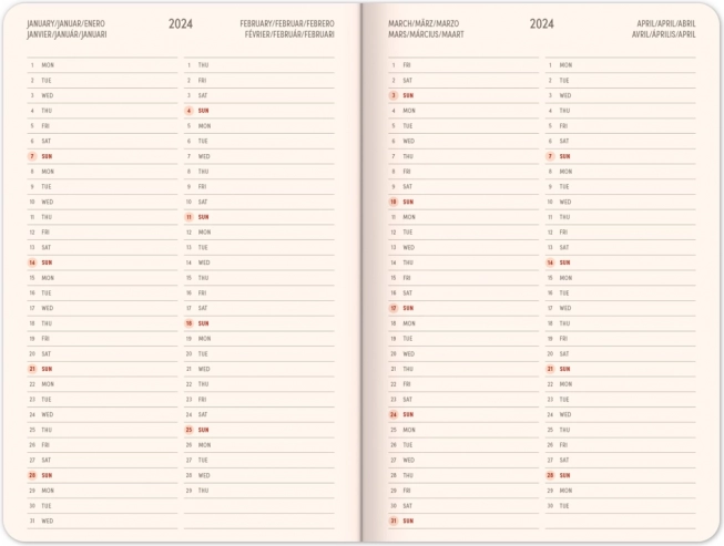 Il layout settimanale a colonne offre spazio sufficiente per le note ogni giorno. Nell'agenda trovi la panoramica delle festività internazionali, l'elenco dei nomi cechi e slovacchi, le panoramiche annuali 2024 e 2025, una pratica rubrica e una taschina sul risguardo posteriore per i piccoli oggetti.