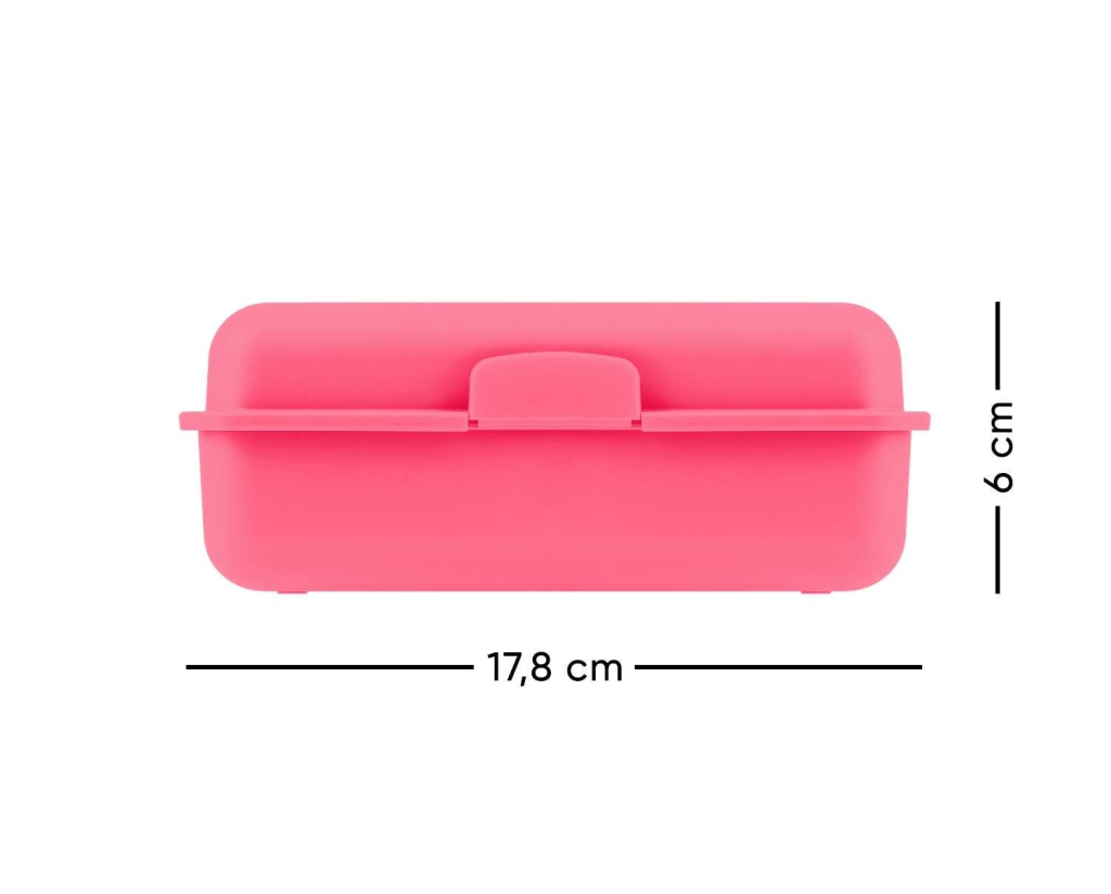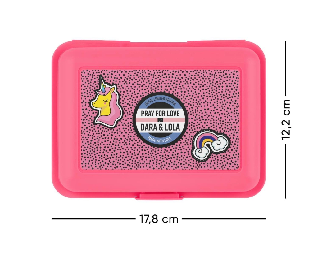 • Pratica scatola porta pranzo in plastica con motivo disegnato dalla figlia di Dara Rolins e chiusura con un unico gancio