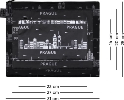 Ogni pochette ha una pratica chiusura superiore con zip e una stampa a contrasto con il panorama di PRAGA. Grazie al colore nero e al design senza tempo si abbina facilmente a qualsiasi bagaglio. Il set è anche un souvenir di stile o un regalo perfetto per gli amanti della città.