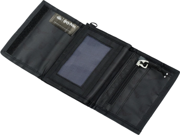 Il motivo nero con temi di Hogwarts conferisce al portafoglio un aspetto unico.