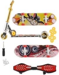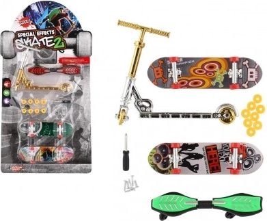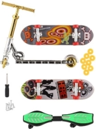 2× mini skateboard, 1× finger monopattino, 1× waveboard, ruotine, viti, mini cacciavite