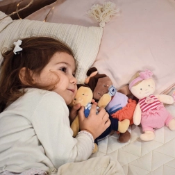 La graziosa mini bambola del marchio Doudou, alta 18 cm con corpicino morbido ed elastico, è ideale per i più piccoli. Ha un viso in cotone con occhietti, bocca e guance ricamati e tiene in mano una piccola boccetta. I materiali delicati sono gentili sulla pelle sensibile, la bambola stimola la motricità fine e soddisfa le norme di sicurezza europee CE.