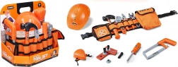 Pratico set per piccoli riparatori che include tutto il necessario per giocare in sicurezza e per i primi esperimenti da “fai‑da‑te”. È incluso un cinturone in tessuto per portare comodamente gli attrezzi, un casco e una ricca dotazione: mascherina, seghetta, martelletto, pinze universali, chiave a rullino, cacciavite, chiave, 2 listelli, 3 viti e 3 dadi.
