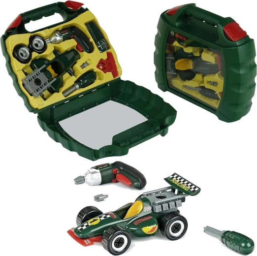 Questo set realistico con licenza BOSCH mini include l’avvitatore a batteria Ixolino con bit rotante ed effetto sonoro, un cacciavite, viti e tutti i pezzi necessari per costruire l’auto da corsa verde scuro. Il tutto è riposto ordinatamente in una robusta valigetta di plastica con coperchio trasparente e manico comodo, così il gioco può accompagnarvi ovunque.