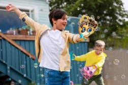 L'uso è semplice: apri la bustina con la soluzione, indossa il guanto, immergilo e agitalo nell'aria — le bolle inizieranno a formarsi subito. Perfetto per giardini, parchi e feste per bambini. Dopo il gioco richiudi la bustina e conservala per la prossima volta.
