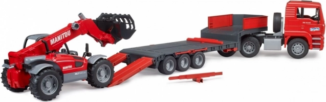 Questo robusto set combina un modello realistico del camion MAN TGA con rimorchio ribassato e un dettagliato caricatore telescopico MANITOU MT633. I bambini apprezzeranno elementi funzionali come gli specchietti ripiegabili, il cofano apribile, il parabrezza resistente, le rampe mobili e i supporti del rimorchio. Il caricatore dispone di un braccio telescopico estensibile e regolabile in altezza e di una benna rimovibile: pronto per qualsiasi sfida di cantiere.