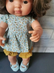 Elegante set in mussola per bambole da 38 cm del marchio Mirabelki, cucito in Polonia. Il materiale morbido è piacevole al tatto e di facile manutenzione. Può essere stirato a bassa temperatura, preferibilmente trattato a vapore per preservare la struttura della mussola. Adatto ai bambini da 3 anni, con dichiarazione di conformità CE per un gioco sicuro.