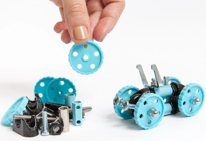 Componenti di costruzione, ruote, connettori intelligenti, attrezzi per il montaggio