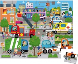 Puzzle JANOD con l’immagine di una città vivace. Il puzzle è confezionato in una valigetta originale e pratica, adatta sia per casa che per i viaggi. La confezione include un poster come modello.