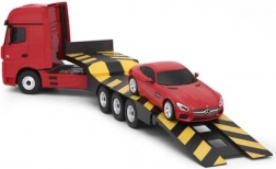 Il controllo a 2,4 GHz offre portata affidabile e la possibilità di guidare più modelli contemporaneamente senza interferenze. Il Mercedes-Benz Actros dispone inoltre di illuminazione funzionante durante la marcia; il semirimorchio consente di “caricare” facilmente la AMG GT, rendendo possibile un trasporto realistico e manovre dinamiche.