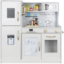 L’elegante cucina XL in legno del marchio KRUZZEL in colore bianco con dettagli dorati offre un gioco realistico grazie a illuminazione LED, suoni dei bruciatori e a un ricco set di accessori. La solida struttura in legno, le ante con chiusura a “click”, il lavello estraibile e gli elettrodomestici come forno e microonde favoriscono il gioco creativo e lo sviluppo della motricità fine.
