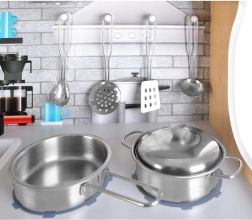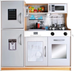 La cucina è realizzata in legno di alta qualità, che la rende stabile, resistente e sicura. Include ricchi accessori in metallo – pentola, padella, coperchio e 4 utensili – e un lavello estraibile per un facile “lavaggio” delle stoviglie. Il design neutro e i colori sono adatti sia a bambine che a bambini.