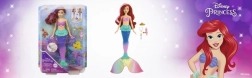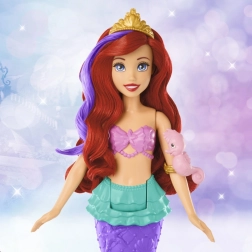 Il set comprende un delizioso cavalluccio marino che può essere agganciato al braccio di Ariel, una tiara, una collana e un trampolino. I bambini possono così rivivere momenti preferiti del film o creare avventure sottomarine proprie. Ariel ha lunghi capelli rossi e una coda marina vistosa con top a conchiglia e pinna morbida metallica.
