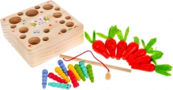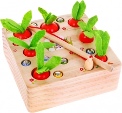 Il gioco in legno con carotine è progettato per stimolare la curiosità e favorire lo sviluppo della motricità fine e la coordinazione occhio-mano. I bambini possono imparare a riconoscere forme e colori e migliorare le loro abilità con la canna da pesca magnetica. Questo gioco è ideale per giocare sia da soli che in gruppo. Con la canna da pesca magnetica, i bambini devono rimuovere tutti i vermi e poi raccogliere le carote per proteggere le verdure in crescita.