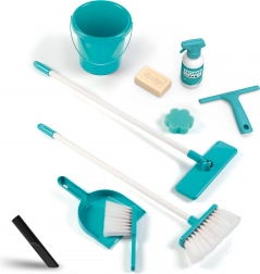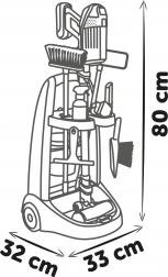 Il carrello include scopetta, mocio, paletta, scopa, secchio, spugna e detergenti, che coinvolgono pienamente i bambini nelle attività di pulizia immaginaria.