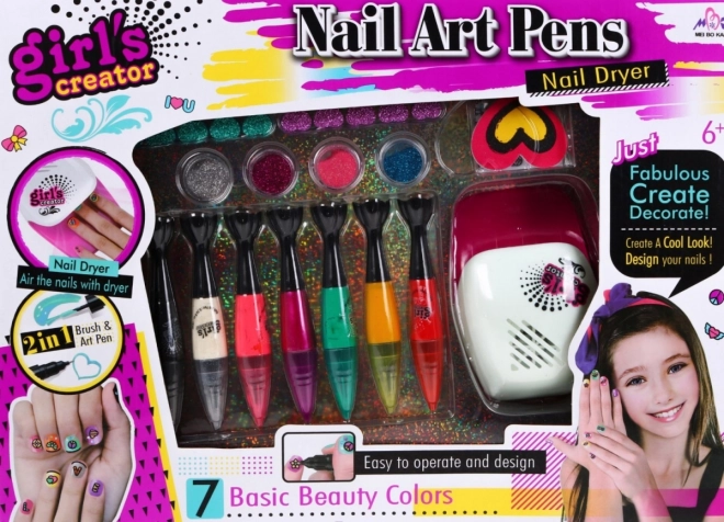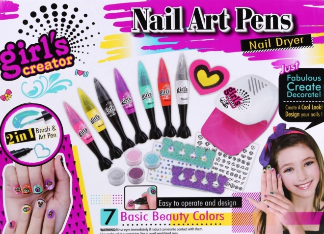 Include un asciuga smalto alimentato a batterie, gemme decorative, una varietà di adesivi e altri strumenti per l'arte delle unghie.
