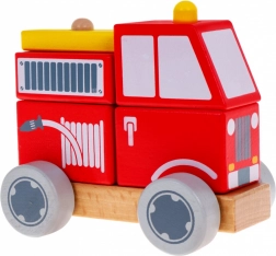 La base con due pioli e i pezzi colorati permettono ai bambini di assemblare facilmente il proprio camioncino dei pompieri e allenare la motricità fine.