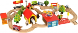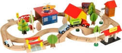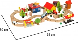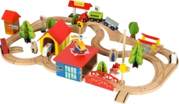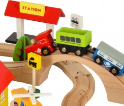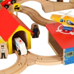Scopri le possibilità illimitate con questo colorato set di treno in legno. Il set include una stazione, ponti, un'area di atterraggio per l'elicottero, figurine e altri elementi che permettono di creare la propria città.