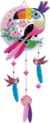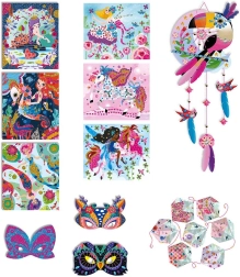 Acchiappasogni (10 piume, cordino rosa, motivo uccellino); Ghirlanda origami (25 fogli di carta origami, cordino rosa); 3 schede con glitter e paillettes; 3 schede a mosaico con tasselli in gommapiuma; 3 maschere da grattare e raschietto in legno