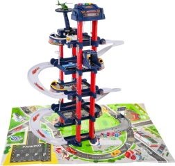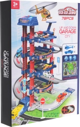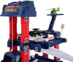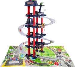 Il parcheggio multilivello offre posti auto, una stazione di servizio, un sollevatore per auto e un eliporto. Il pannello di controllo con pulsanti colorati gestisce l’ascensore e attiva gli effetti: il pulsante rosso abbassa l’ascensore, quello giallo lo solleva. Il pulsante blu riproduce suoni di polizia, pompieri, ambulanza, avviamento e spari, mentre il pulsante verde attiva il clacson. Sul pannello lampeggiano luci blu e rosse che amplificano l’atmosfera di gioco.