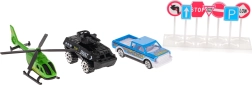 elementi costruttivi del parcheggio, tappetino da gioco, 2 macchinine in metallo, elicottero, 7 segnali stradali, adesivi decorativi, manuale illustrato