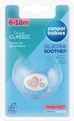 Il succhietto in silicone è realizzato in silicone trasparente, completamente insapore e inodore. Il succhietto è privo di BPA. Confezione da 1 pezzo. Vantaggi dei succhietti Canpol babies: - si sfiatano bene; potete verificarlo facilmente premendo la tettarella (non sottovalutate questa caratteristica: una scarsa ventilazione del succhietto può portare a deformazioni del palato e della masticazione del bambino); - i fori di ventilazione nello scudo del succhietto consentono la circolazione dell’aria, l’evacuazione della saliva e prevengono l’irritazione della pelle intorno alla bocca; - l’anello del succhietto è ben fissato, facilita la somministrazione al bambino e permette di attaccare una catenella; - disponibili in vari colori accattivanti. Completate il succhietto con una catenella dello stesso design. Istruzioni d’uso: Prima del primo utilizzo, per motivi igienici, sterilizzate il succhietto in acqua bollente per circa 5 minuti. Dopo il raffreddamento, spremete l’acqua residua dal succhietto. Prima di ogni utilizzo, lavate accuratamente il succhietto in acqua tiepida. Non utilizzate detergenti antibatterici o chimici. L’uso eccessivo di detergenti può danneggiare le parti in plastica. Non immergete mai il succhietto in sostanze zuccherate o medicinali: esponete il bambino al rischio di carie e danni allo smalto. Utilizzate il succhietto per un massimo di 1-2 mesi, poi sostituitelo per motivi igienici e di sicurezza. Se il succhietto dovesse entrare completamente nella bocca del bambino, NON FATEVI PRENDERE DAL PANICO: è progettato in modo tale da non poter essere ingerito e può essere rimosso in sicurezza. Rimuovetelo il più delicatamente possibile. Conservate il succhietto in un astuccio pulito, asciutto e chiuso. Si sconsiglia l’uso del succhietto per bambini oltre i 3 anni. Importante! Per la sicurezza e la salute del vostro bambino! Controllate lo stato del succhietto prima di ogni utilizzo. Testate la resistenza della tettarella tirandola a fondo in tutte le direzioni. Ai primi segni di danneggiamento, gettate subito il succhietto e non riutilizzatelo. Usate solo portaciucci conformi alla norma EN12586. Non fissate mai il succhietto a cordini, lacci o nastri degli indumenti: il bambino potrebbe soffocare. Non lasciate il succhietto alla luce diretta del sole, vicino a fonti di calore o in soluzioni disinfettanti più a lungo del raccomandato: ciò può indebolire la tettarella. Il succhietto in silicone è conforme a: Direttiva del Parlamento Europeo e del Consiglio 2001/95/CE sulla sicurezza generale dei prodotti, EN 1400-1 Prodotti per la cura del bambino – Succhietti per lattanti e bambini piccoli – Parte 1: Requisiti generali di sicurezza e informazioni sul prodotto, EN 1400-2 Prodotti per la cura del bambino – Succhietti per lattanti e bambini piccoli – Parte 2: Requisiti meccanici e prove, EN 1400-3 Prodotti per la cura del bambino – Succhietti per lattanti e bambini piccoli – Parte 3: Requisiti chimici e prove.