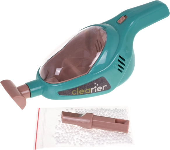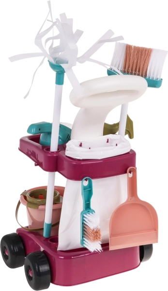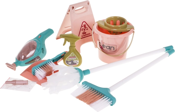 Il grande set per le pulizie con aspirapolvere manuale e carrello porta-accessori è adatto ai bambini dai 3 anni. Il set è stato realizzato con attenzione ai dettagli utilizzando materiali di altissima qualità ed è completamente sicuro per il bambino. Il carrello ha ruote grandi, una comoda maniglia di spinta e due ripiani per riporre tutti gli accessori per la pulizia. Il set comprende molti accessori, ad esempio un secchio per il mocio, una spazzola, una paletta e una scopetta, un finto lavasciuga, un aspirapolvere manuale a batterie, palline di polistirolo, un sacco di plastica per i rifiuti e un cartello di avviso. L’aspirapolvere manuale è alimentato da 3 batterie AA 1,5V, non incluse nella confezione. Dispone di funzioni sonore e luminose, accessori intercambiabili e aspira realmente le palline di polistirolo incluse nel set. Durante l’aspirazione si sentono suoni tipici dell’attività e l’interno dell’aspirapolvere è illuminato.