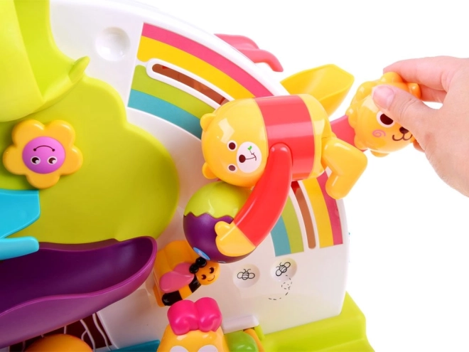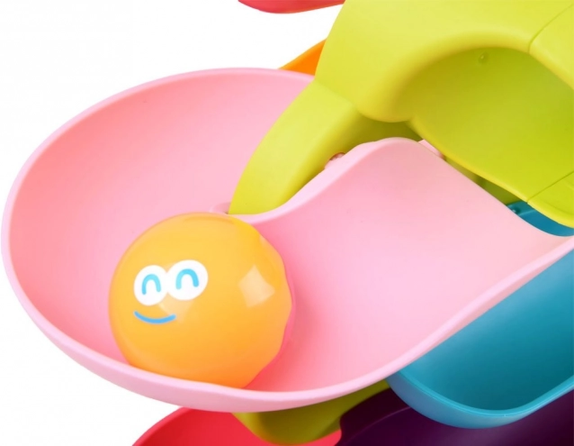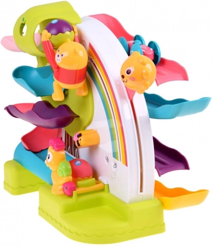 Una melodia allegra accompagna il percorso delle biglie. Il volume può essere regolato o il suono completamente disattivato: ideale per giocare a casa o in viaggio.