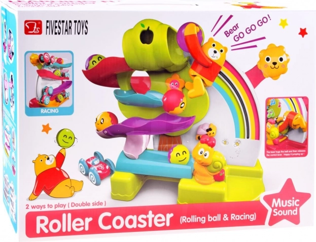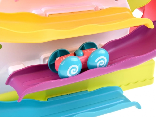 La pista interattiva 2in1 colpisce per i colori vivaci, le simpatiche figurine e gli effetti accattivanti. In modalità biglie, tirando la levetta con la testolina del leoncino, la biglia viene spostata al livello più alto e scende attraverso quattro piani, accompagnata da musica allegra con possibilità di regolazione del volume o di spegnimento completo. In modalità macchinina basta lasciare l’auto dall’alto e guardarla sfrecciare fino al traguardo.