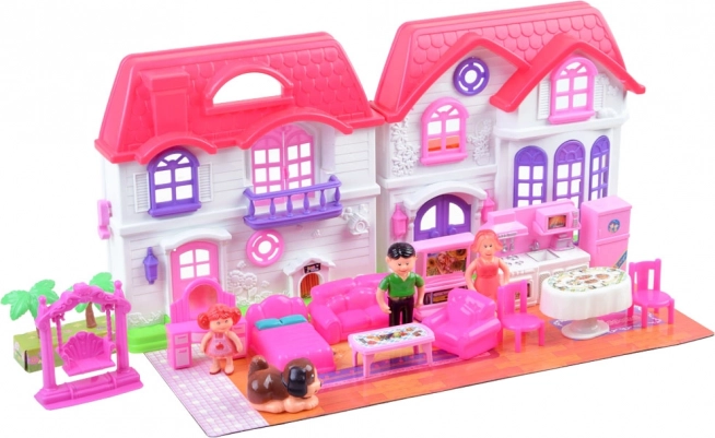 Elegante casa delle bambole pieghevole per la famiglia in plastica resistente regala ai bambini ore di divertimento fantasioso. Include ricchi accessori, personaggi della famiglia e un cagnolino, campanello luminoso e adesivi colorati per personalizzare ogni stanza.