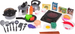 Questo incredibile set cucina contiene tutto ciò di cui un piccolo cuoco può avere bisogno. Fornello a induzione, alimentato da tre batterie AA, consente suoni realistici di frittura e cottura, elementi di plastica sicuri come pentole, padelle e altri accessori sono ideali per il gioco dei bambini, senza bordi taglienti e rischio di lesioni. Il set include varie repliche di alimenti tra cui uova, pesce e verdure, che aggiungono autenticità al gioco.
