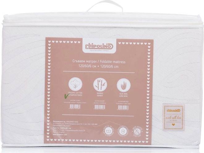 Il materasso pieghevole CHIPOLINO con dimensioni 120 × 60 cm unisce comfort naturale e praticità. Il rivestimento in cotone BIO/organico è delicato sulla pelle, privo di pesticidi e sostanze chimiche nocive, ideale anche per bambini sensibili e allergici. L’anima in schiuma di poliestere di alta qualità offre un supporto bilanciato della colonna con lunga durata.