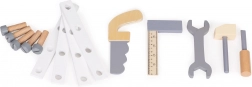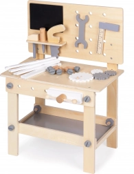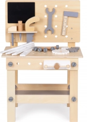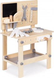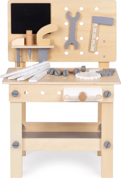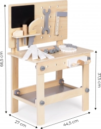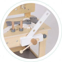 Inclusi una morsa funzionante e ingranaggi azionati che insegnano i principi base delle trasmissioni. Utensili e accessori sono interamente in legno, lisci e dipinti con colori sicuri. Il pannello superiore forato aiuta a organizzare gli attrezzi in modo ordinato; è presente anche una lavagnetta per appunti e schizzi.