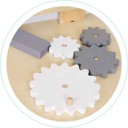 Il set di ruote in movimento insegna ai bambini i principi delle trasmissioni. Basta far girare una ruota e le altre si mettono in moto: un modo divertente per imparare e allenare la motricità fine.