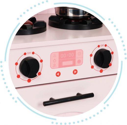 Le manopole girevoli sulla cucina permettono di simulare la cottura sui fornelli e nel forno. I bambini ottengono così uno spazio sicuro per i loro esperimenti culinari.