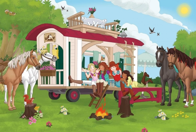 Goditi un divertimento creativo con il puzzle SCHMIDT con il motivo Schleich falò presso la caravan. Il set include 100 pezzi e come regalo una figurina del puledro Hannover Schleich. Una volta completato, il puzzle misura circa 36,1 × 24,3 cm – dimensione ideale per bambini e per il gioco in famiglia.