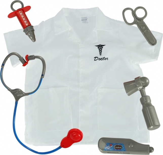 Include un camice medico e strumenti sanitari: stetoscopio, forbici, siringa, termometro e martelletto a riflesso.
