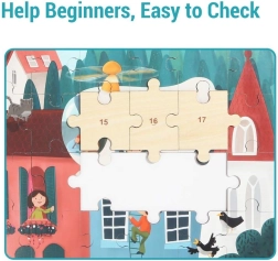 Ogni pezzo di legno ha un numero sul retro. I bambini allenano logica, conteggio e pazienza senza frustrazioni inutili.
