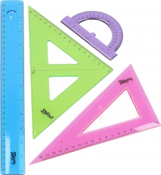 Righello 30 cm (blu), piccolo goniometro (viola), 2× triangolo (rosa e verde)