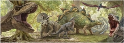 Questo puzzle contiene illustrazioni dettagliate di diversi dinosauri, dal Tirannosauro al Triceratopo, nel loro ambiente naturale.