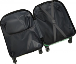 L’interno è suddiviso in due scomparti: uno con tasca in rete e l’altro con cinghie incrociate per fissare in sicurezza il contenuto. Le quattro ruote piroettanti e la maniglia estraibile permettono ai bambini di guidare facilmente la valigia.