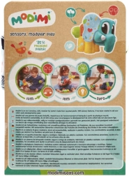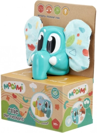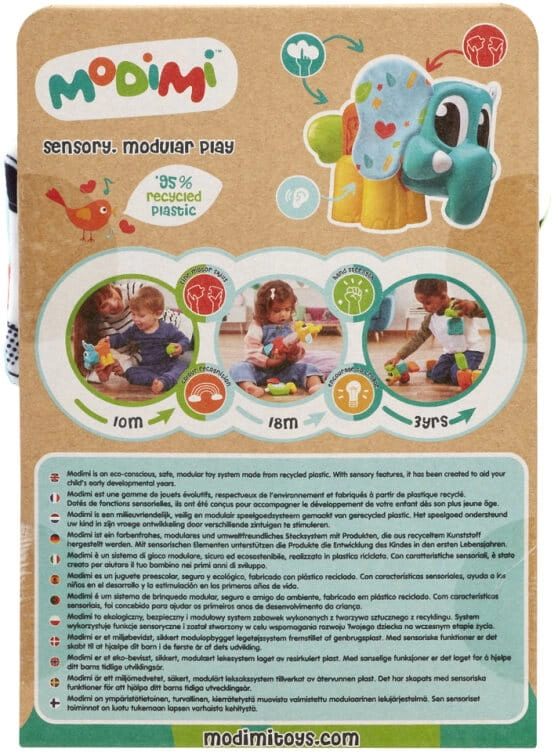 La dolce elefantina Ellie del marchio Modimi è un giocattolo sensoriale ecologico, sicuro e modulare in plastica riciclata, che sostiene lo sviluppo precoce del bambino. Offre morbide orecchie fruscianti, una pancina–mattoncino testurizzata, un set di zampette e una codina. I pezzi di diversi set Modimi si possono combinare facilmente per ancora più divertimento creativo.