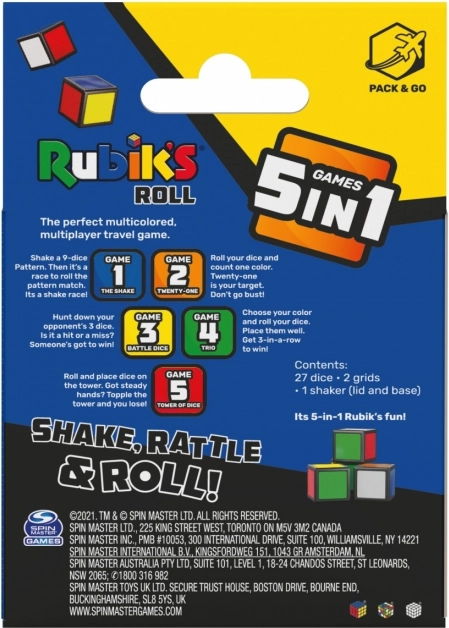 Il Rubik Roll è un gioco portatile che include 27 dadi, uno shaker e due griglie. Questo gioco dinamico comprende cinque giochi: Shake, Ventuno, Battaglia Dadi, Trio e Torre dei Dadi, che combinano varie abilità, come conteggio e posizionamento strategico dei dadi.