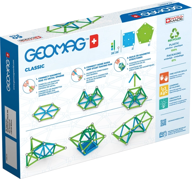 Geomag Classic Recycled è un set ecologico di costruzioni magnetiche che combina divertimento ed educazione per bambini dai 3 anni. Contiene 60 pezzi realizzati in plastica riciclata al 100% che supportano lo sviluppo della creatività e della motricità fine.