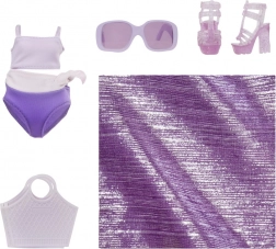 Gli accessori includono abbigliamento viola, occhiali da sole, scarpe e una piccola borsa, che consentono varie variazioni e temi di moda come spiaggia o estate.