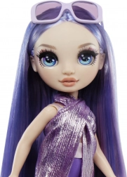 La bambola ha lunghi capelli viola che si adattano perfettamente ai suoi grandi occhi blu. Un outfit lucido e stiloso insieme agli occhiali da sole viola portano un tema di moda al gioco.