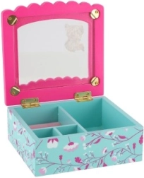 Questo portagioie decorativo in legno di qualità è una soluzione ideale per riporre ordinatamente anelli, orecchini e piccoli tesori. Il coperchio rosa con parte in vetro/trasparente e specchietto interno facilita una scelta rapida degli accessori, mentre la base turchese con delicato motivo floreale aggiunge un tocco magico all'arredo.