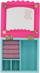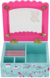 All'interno trovi scomparti ben organizzati che mantengono i gioielli separati e protetti. Grazie alla solida struttura in legno e alle cerniere affidabili, il portagioie è non solo bello ma anche resistente all'uso quotidiano. Il design fantasioso è perfetto sia come confezione regalo sia come decorazione per la cameretta.