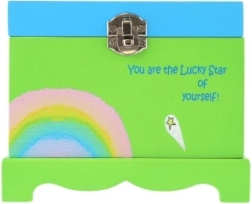 La struttura in legno resistente con chiusura in metallo e il grazioso motivo con unicorno e arcobaleno si adattano a qualsiasi cameretta. Le dimensioni compatte permettono di posizionare il portagioie su mensole o cassettiere, offrendo al contempo spazio sufficiente per anellini, orecchini e piccoli souvenir.