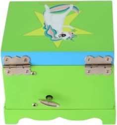 Questo portagioie musicale offre un luogo sicuro e ordinato per i tesori dei bambini. All'apertura del coperchio con specchietto integrato, dopo aver caricato la chiavetta, l'unicorno bianco‑rosa inizia a girare e parte una melodia che regala un sorriso a ogni apertura.